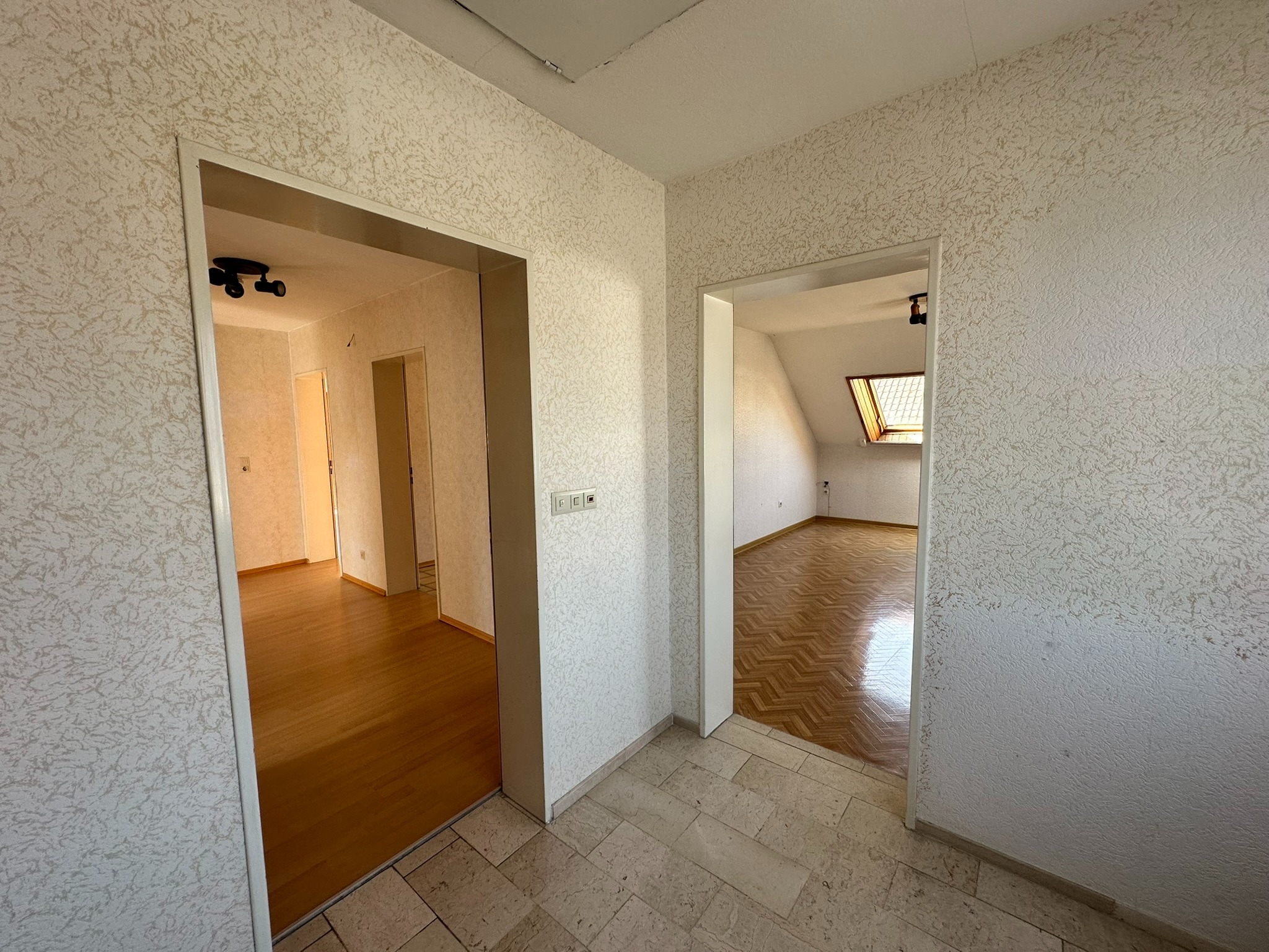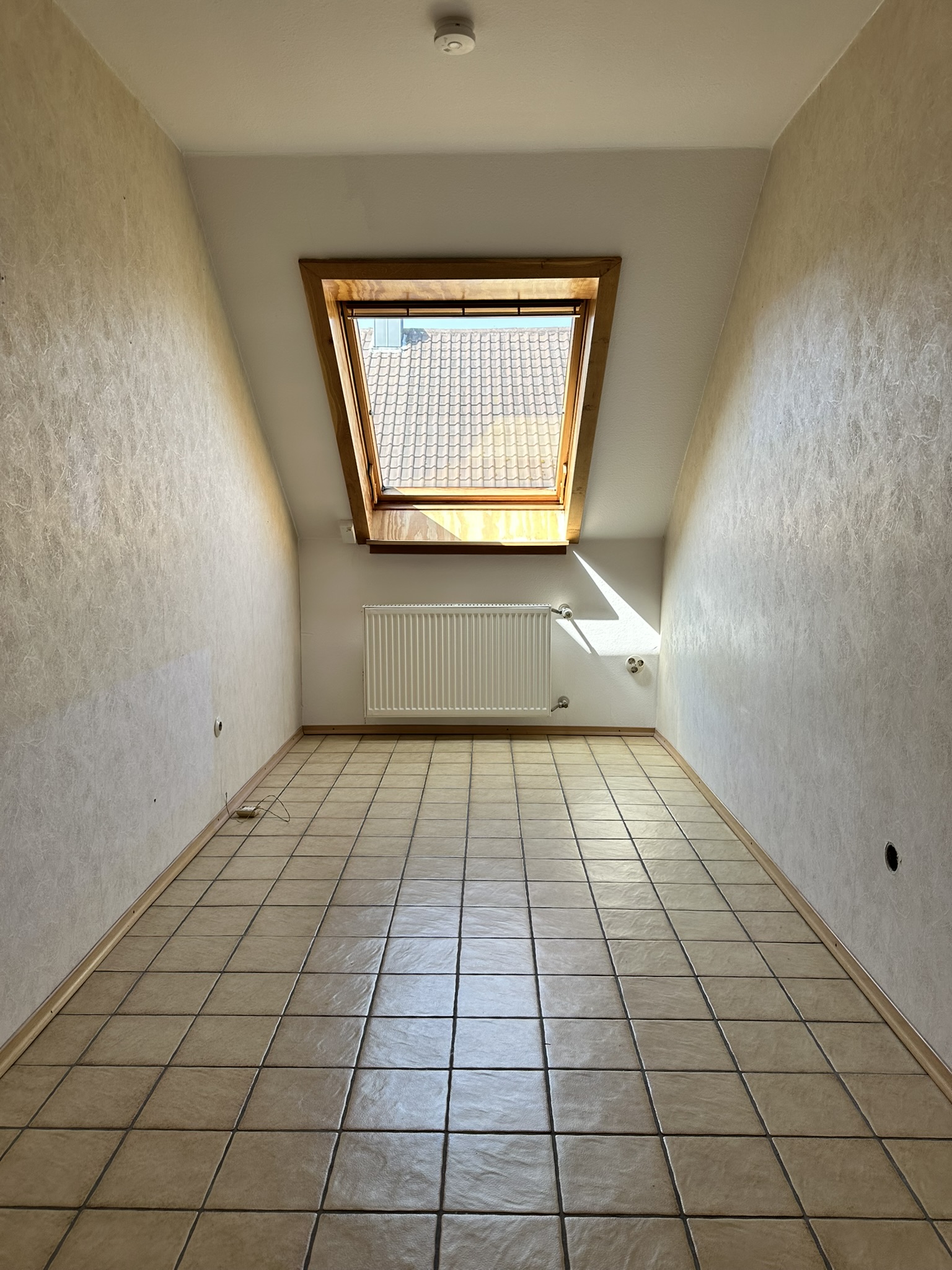 Im Obergeschoss befindet sich ein ebenfalls großes Wohnzimmer mit daneben liegender Küche, ein Schlafzimmer – beides mit Zugang zum Ostbalkon mit Gartenblick. Wohnzimmer und Küche ließen sich auch hier zu einem Bereich verbinden. Weiter gibt es im OG ein kleines Arbeits- oder Kinderzimmer, ein Tageslichtbadezimmer und eine Abstellkammer.