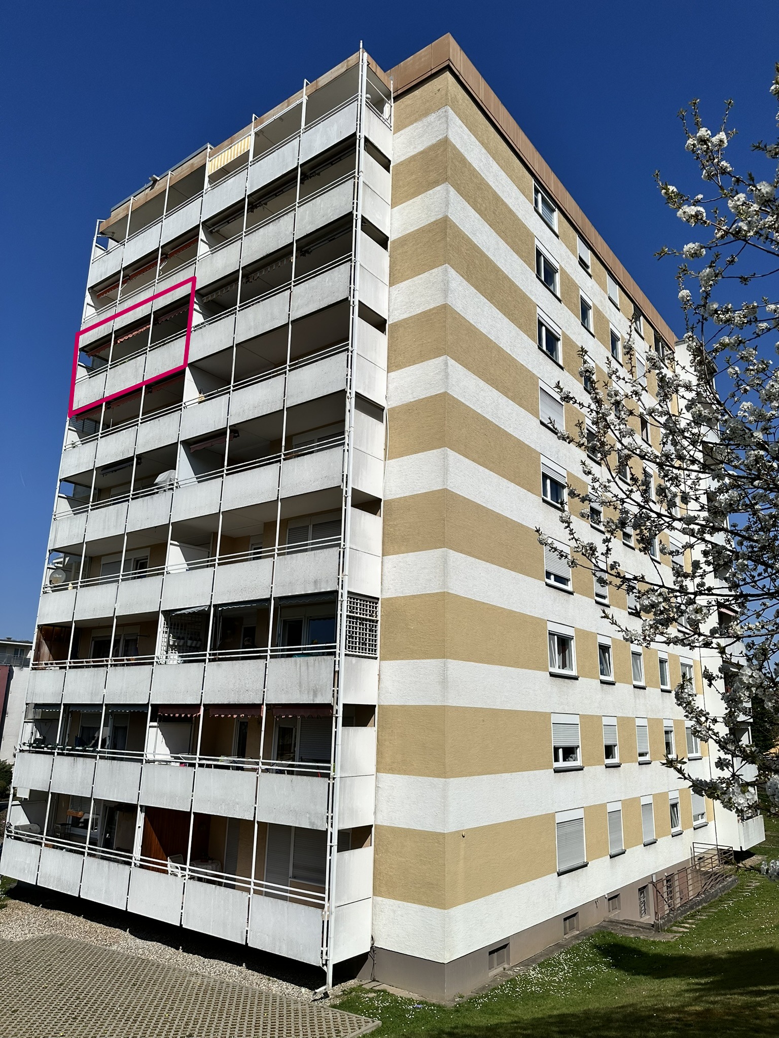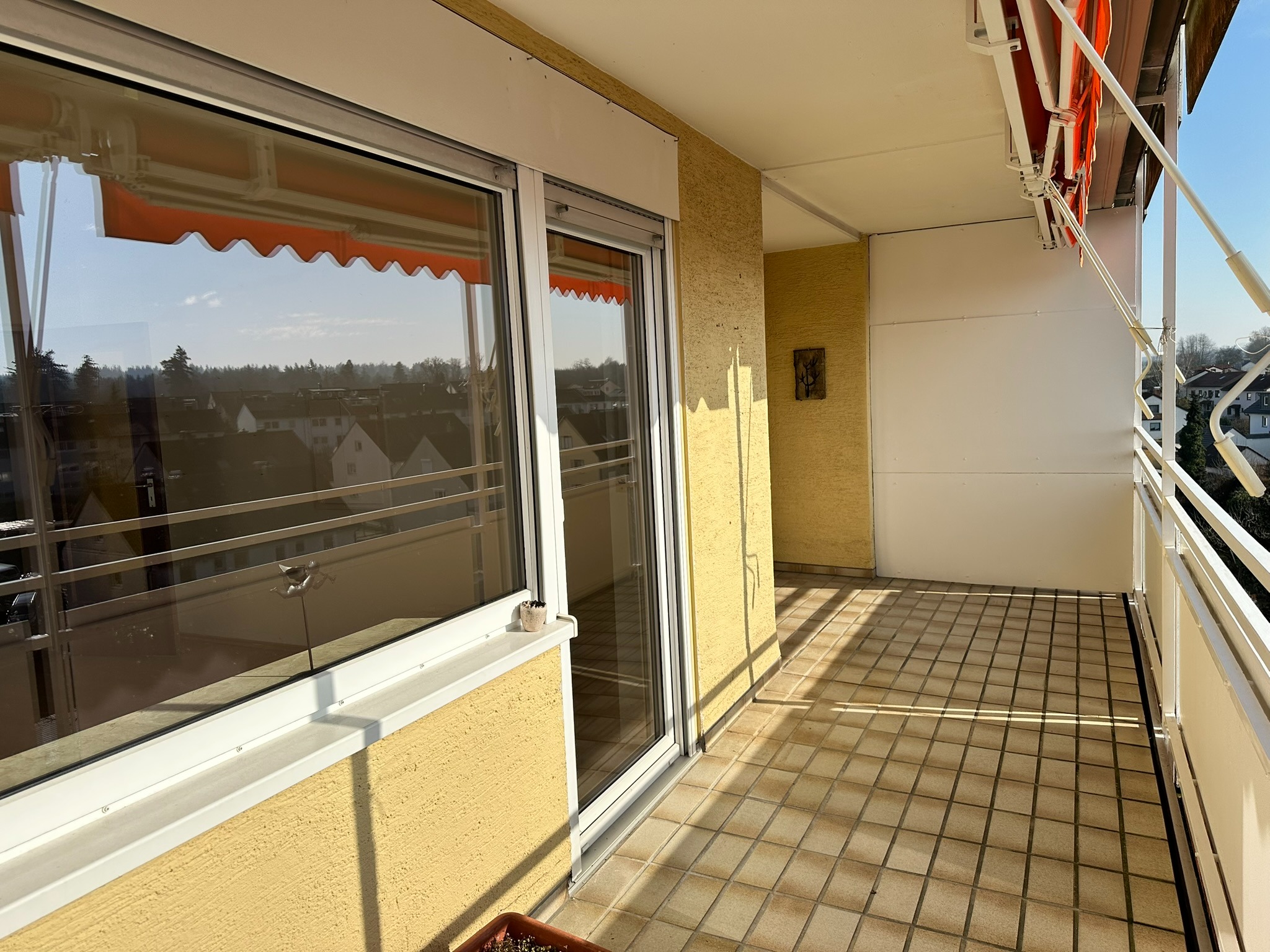 Diese helle und freundliche 3-Zi-Wohnung befindet sich im 7.OG eines 9 geschossigen Wohnhauses. Sie ist nach Süden ausgerichtet und Sie haben einen wunderbaren Blick Richtung Schwarzwald, Ettlingen und die Pfalz. Der Balkon ist großzügig und Sie haben viel Platz für einen schönen Essbereich, von dem aus Sie herrliche Sonnenuntergänge beobachten können. Damit es Ihnen im Sommer nicht zu warm wird, liefern neue Markisen Schatten.